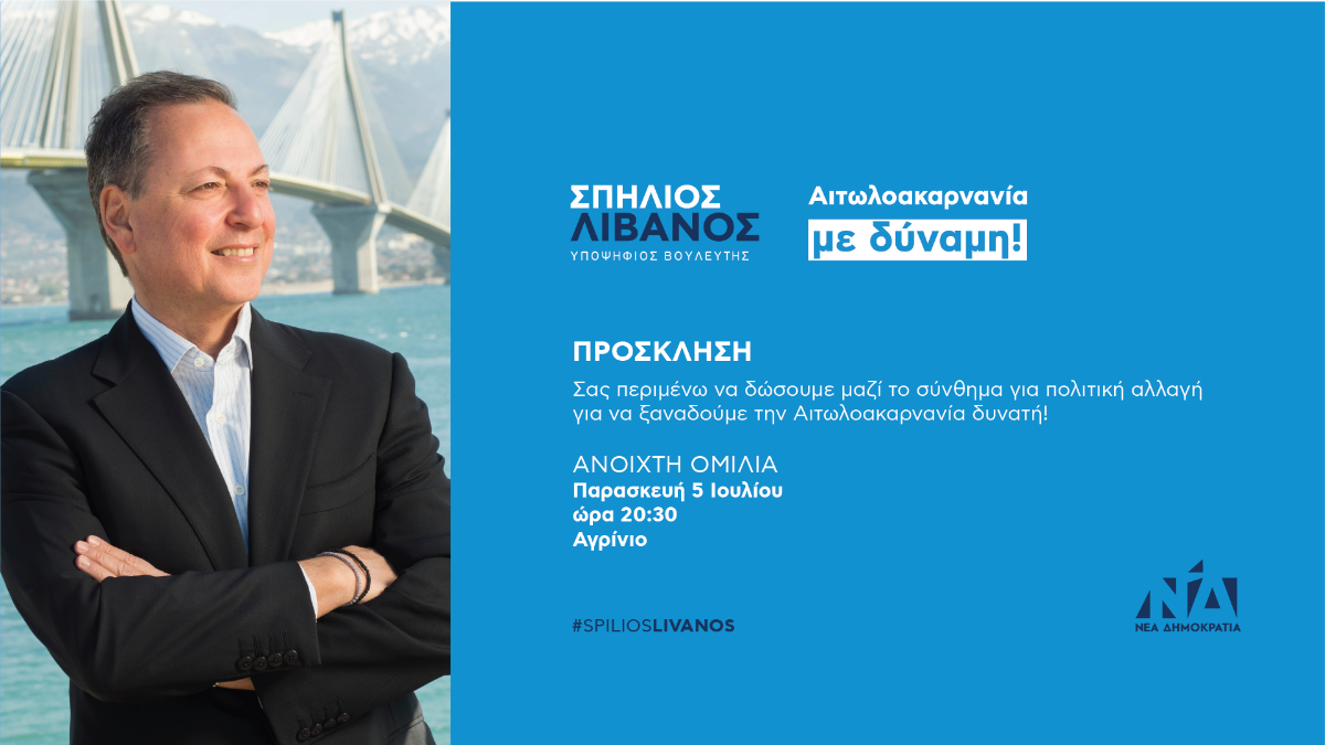 Το όραμά του για την Αιτωλοακαρνανία θα παρουσιάσει ο υποψήφιος Βουλευτής Αιτωλοακαρνανίας της Νέας Δημοκρατίας Σπήλιος Λιβανός, σε ανοιχτή ομιλία στο Αγρινίο την Παρασκευή 5 Ιουλίου και ώρα 20:30.