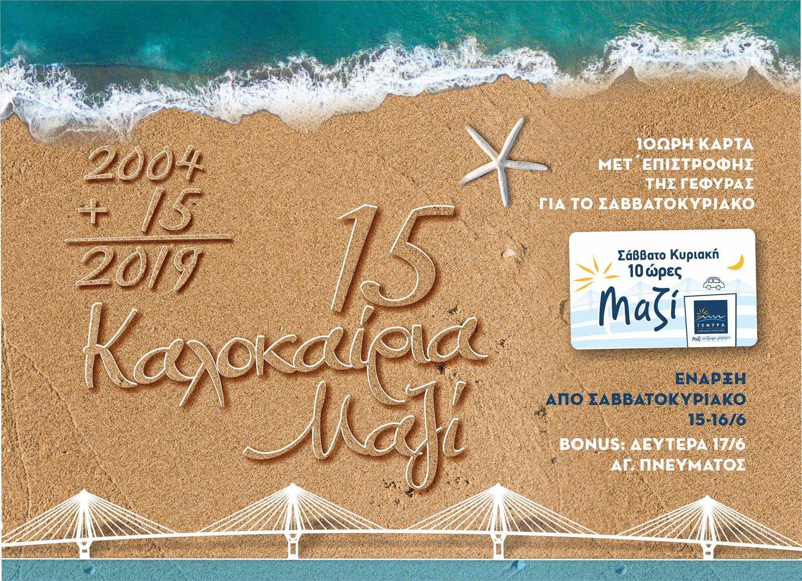 H ΓΕΦΥΡΑ Α.Ε. ανακοινώνει την ενεργοποίηση της 10ωρης θερινής (εκπτωτικής και μετ’ επιστροφής) κάρτας Σαββατοκύριακου «Μαζί», το Σαββατοκύριακο 15-16 Ιουνίου, στην τιμή των 13,60€ που παραμένει σταθερή από το 2011.