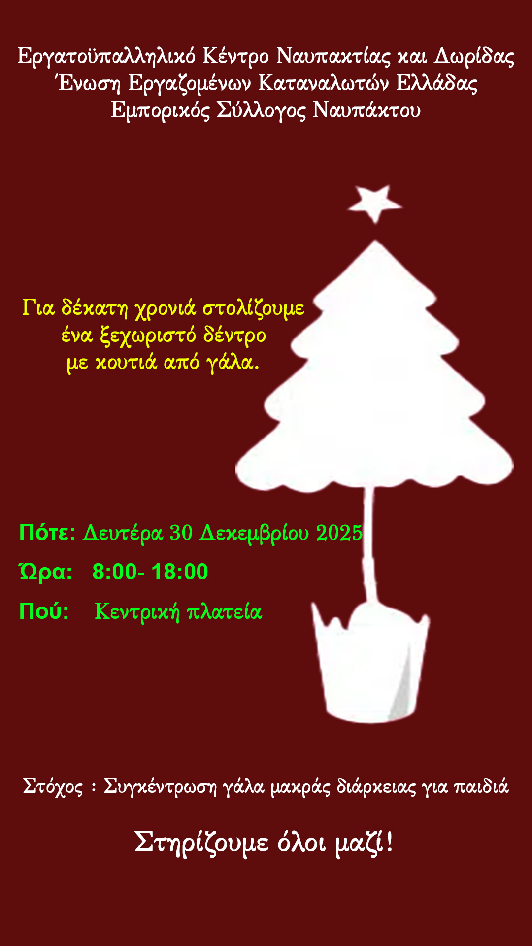 Για Δέκατη Χρονιά ο ΕΜΠΟΡΙΚΟΣ ΣΥΛΛΟΓΟΣ και το ΕΡΓΑΤΙΚΟ ΚΕΝΤΡΟ Ναυπάκτου φτιάχνουμε το ομορφότερο Χριστουγεννιάτικο ΔΕΝΤΡΟ !!!