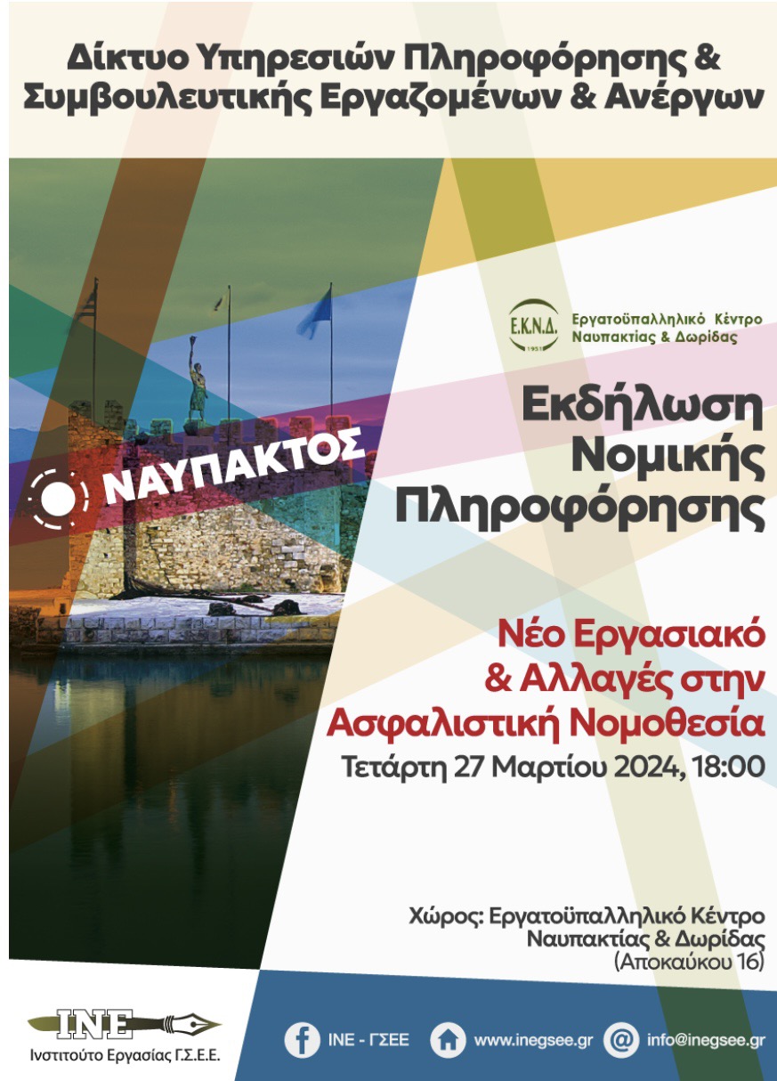 Το Ινστιτούτο Εργασίας της Γ.Σ.Ε.Ε. και το Εργατοϋπαλληλικό Κέντρο Ναυπακτίας & Δωρίδας θα πραγματοποιήσουν την Τετάρτη 27Μαρτίου 2024με ώρα έναρξης 6:00 μ.μ., στην ισόγεια αίθουσα του Ε.Κ.Ν.Δ., Αποκαύκου 16 στη Ναύπακτο, Εκδήλωση Νομικής Πληροφόρησης με θέμα: