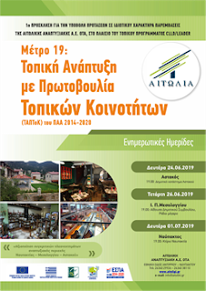 Η ΑΙΤΩΛΙΚΗ ΑΝΑΠΤΥΞΙΑΚΗ Α.Ε. Ο.Τ.Α. στο πλαίσιο υλοποίησης του Τοπικού της Προγράμματος «Τοπική Ανάπτυξη με Πρωτοβουλία Τοπικών Κοινοτήτων (ΤΑΠΤοΚ) CLLD/LEADER» Μέτρο 19 του ΠΑΑ 2014 – 2020, διοργανώνει ημερίδα με θέμα «1η Πρόσκληση για την υποβολή προτάσεων για ιδιωτικού χαρακτήρα παρεμβάσεις».