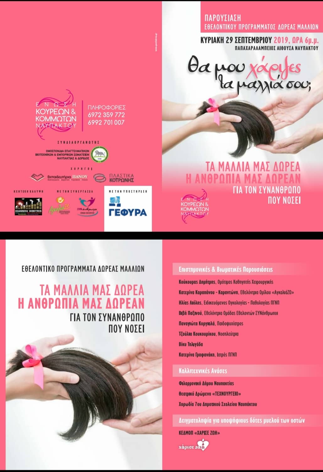 Η Ένωση Κουρέων – Κομμωτών Ναυπάκτου και η Ομοσπονδία Επαγγελματικών, Βιοτεχνικών & Εμπορικών Σωματείων Ναυπακτίας και Δωρίδας συνδιοργανώνουν τη Κυριακή 29/09/2019 και ώρα 18:00μ.μ. στη Παπαχαραλάμπειο αίθουσα Ναυπάκτου εκδήλωση με θέμα : «ΘΑ ΜΟΥ ΧΑΡΙΖΕΣ ΤΑ ΜΑΛΛΙΑ ΣΟΥ ;»