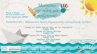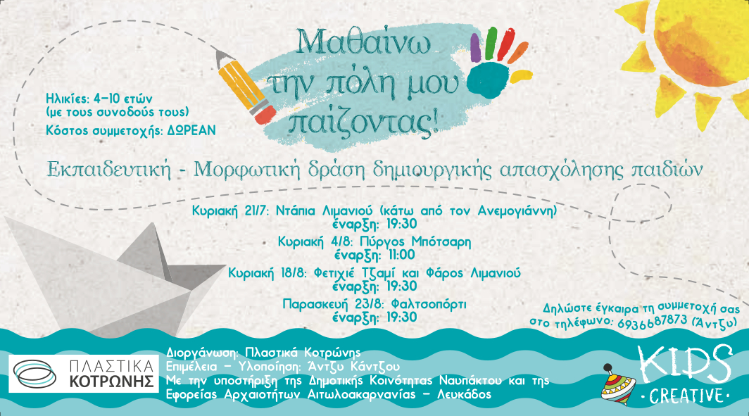 Και φέτος το καλοκαίρι η “Πλαστικά Κ.Κοτρώνης” συνεχίζει τις δράσεις δημιουργικής απασχόλησης «Μαθαίνω την πόλη μου παίζοντας!» που απευθύνονται στα παιδιά, ηλικίας από 4 έως 10 ετών, με δωρεάν συμμετοχή!
