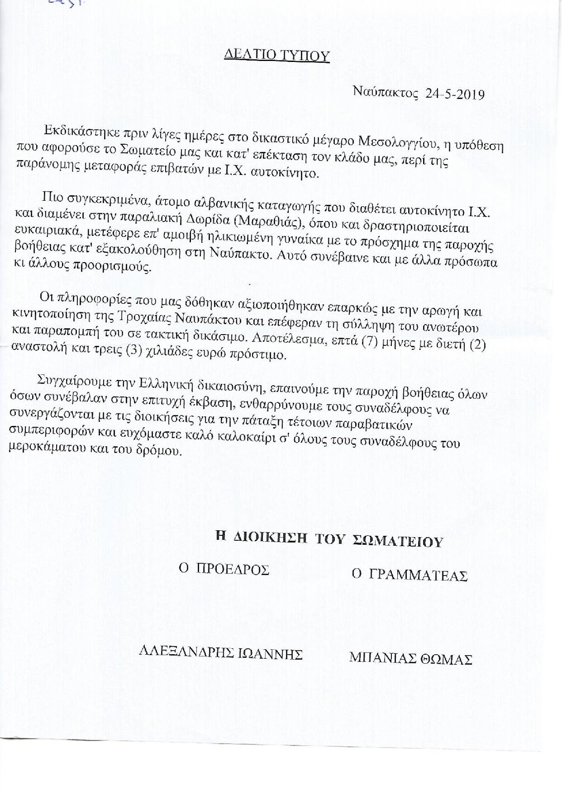 Για την δικαστική έκβαση υπόθεσης παράνομης μεταφοράς ατόμων, με αμοιβή και κατ’ εξακολούθηση, ενημερώνει το Σωματείο των ιδιοκτητών Ταξί στη Ναύπακτο με ανακοίνωσή του. Συγκεκριμένα αναφέρεται σε περιστατικά που λάμβαναν χώρα και μετά από πληροφορίες αξιοποιήθηκαν για να οδηγηθεί η υπόθεση στη δικαιοσύνη.