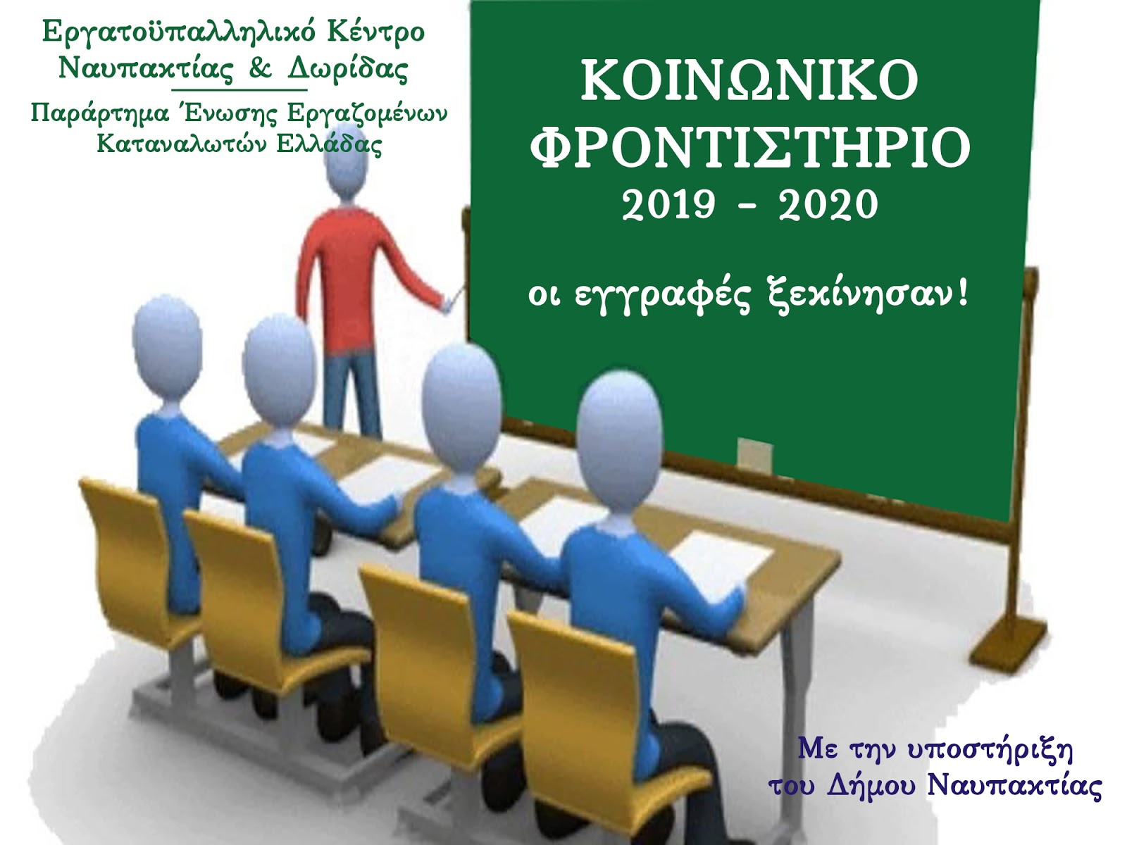 Το Εργατικό Κέντρο Ναυπακτίας και Δωρίδας και η Ένωση Εργαζομένων Καταναλωτών Ελλάδας-Παράρτημα Ναυπακτίας & Δωρίδας, με την υποστήριξη του δήμου Ναυπακτίας ανακοινώνουν ότι ξεκίνησαν οι εγγραφές του Κοινωνικού Φροντιστηρίου για το σχολικό έτος 2019-2020 παρέχοντας πρόσθετη διδακτική υποστήριξη σε μαθητές Γυμνασίου και Λυκείου οικογενειών που αντιμετωπίζουν οικονομικές δυσκολίες.