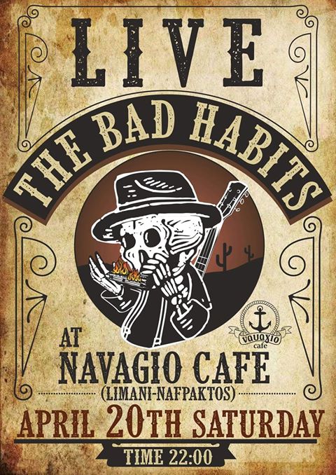 Το Σάββατο 20 Απρίλη στο Ναυάγιο Cafe οι «Bad Habits» θα βρίσκονται live! Οι «Bad Habits» είναι ένα καινούργιο τοπικό σχήμα που παίζει ακουστικό country, western κ rock’n’roll, τιμώντας αγαπημένους καλλιτέχνες όπως Johnny Cash, Social Distortion, Rolling Stones, Bruce Springsteen κ.ά.
