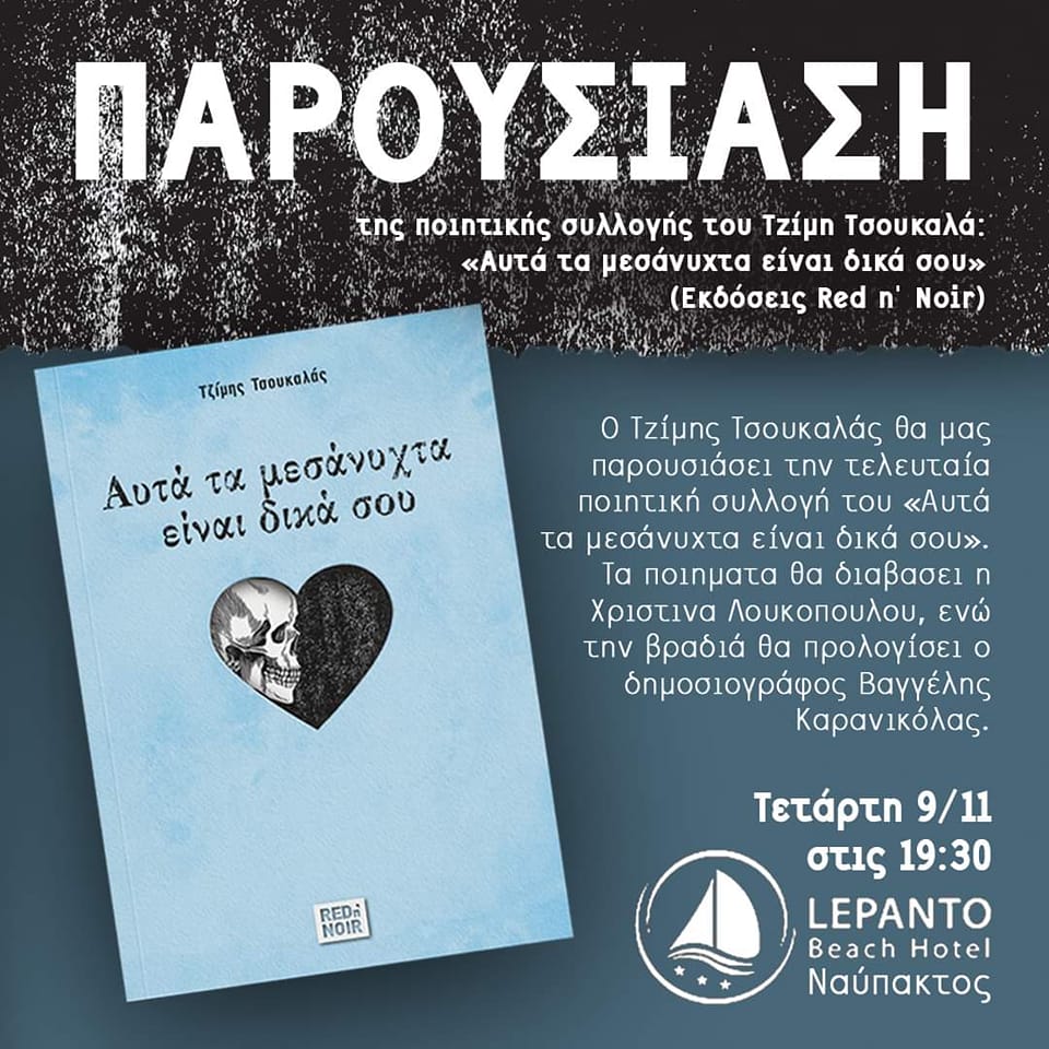 Την Τετάρτη 9 Νοεμβρίου 2022 και ώρα 19:30 στο Lepanto Beach Hotel (Παραλία Γριμπόβου, Ναύπακτος) ο Τζίμης Τσουκαλάς θα παρουσιάσει την τελευταία ποιητική συλλογή του “Αυτά τα μεσάνυχτα είναι δικά σου”.