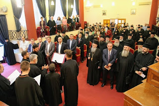 Ἔπειτα, στήν κατάμεστη Αἴθουσα τοῦ Πνευματικοῦ Κέντρου, μετά τά ἐπίκαιρα τροπάρια πού ἔψαλε χορός Ἱεροψαλτῶν ὑπό τόν κ. Παντελῆ Ἀναστασόπουλο, ἀκολούθησαν τά μηνύματα καί οἱ χαιρετισμοί τῶν ἐπισήμων.