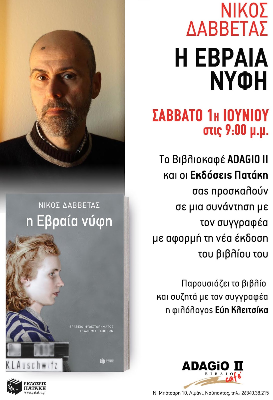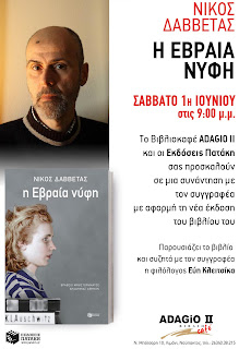 Το καφέ- βιβλιοπωλείο Adagio II θα πραγματοποιήσουν αύριο Σάββατο, 1 Ιουνίου, στις 9:00 μμ, την παρουσίαση του βιβλίου του Νίκου Δαββέτα, «Η Εβραία νύφη», σε μία εκδήλωση μάλιστα όπου το παρών θα δώσει και ο ίδιος ο συγγραφέας.