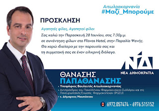 Σήμερα Παρασκευή 28 Ιουνίου, στις 7:30 το απόγευμα, θα πραγματοποιήσει συνάντηση φίλων του στο ξενοδοχείο Φλοίσβος, στην παραλία της Ψανής στη Ναύπακτο, ο υποψήφιος βουλευτής Αιτ/νίας με τη Νέα Δημοκρατία Θανάσης Παπαθανάσης.