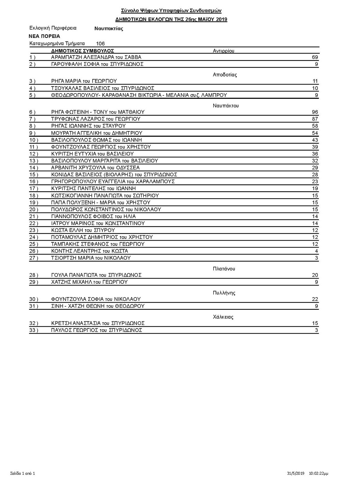 Έστω και με μερικές ημέρες καθυστέρηση έχουμε πλέον και τα τελικά αποτελέσματα της σταυροδοσίας στο δήμο Ναυπακτίας, ανά παράταξη, τα οποία είναι τα εξής: