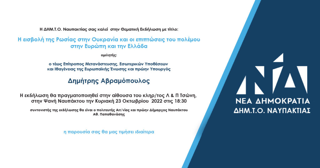 Στη Ναύπακτο την Κυριακή ο Δ. Αβραμόπουλος σε εκδήλωση της Τοπικής Οργάνωσης της Ν.Δ.