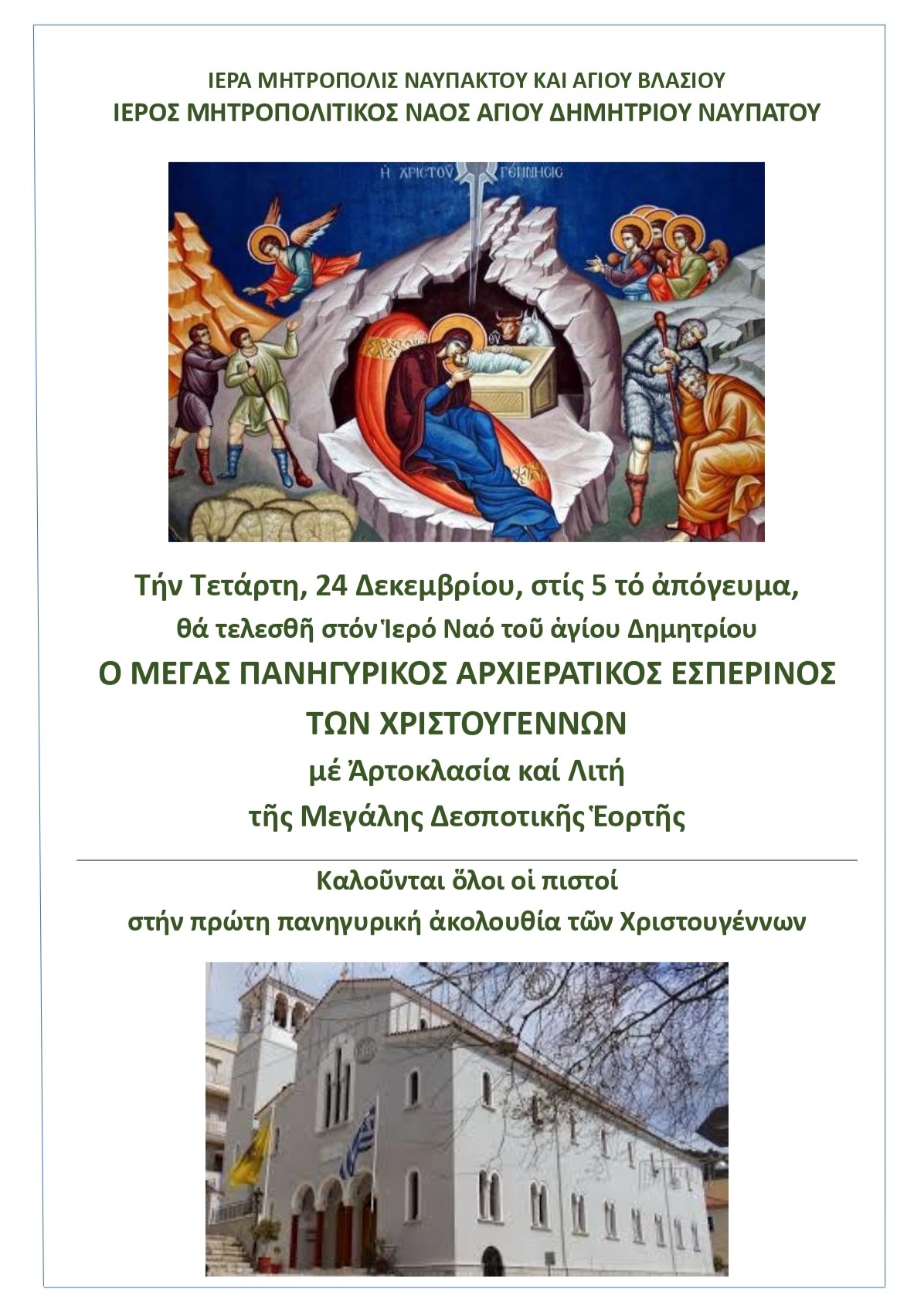 Στις 5 το απόγευμα ο Εσπερινός των Χριστουγέννων στον Άγιο Δημήτριο στη Ναύπακτο