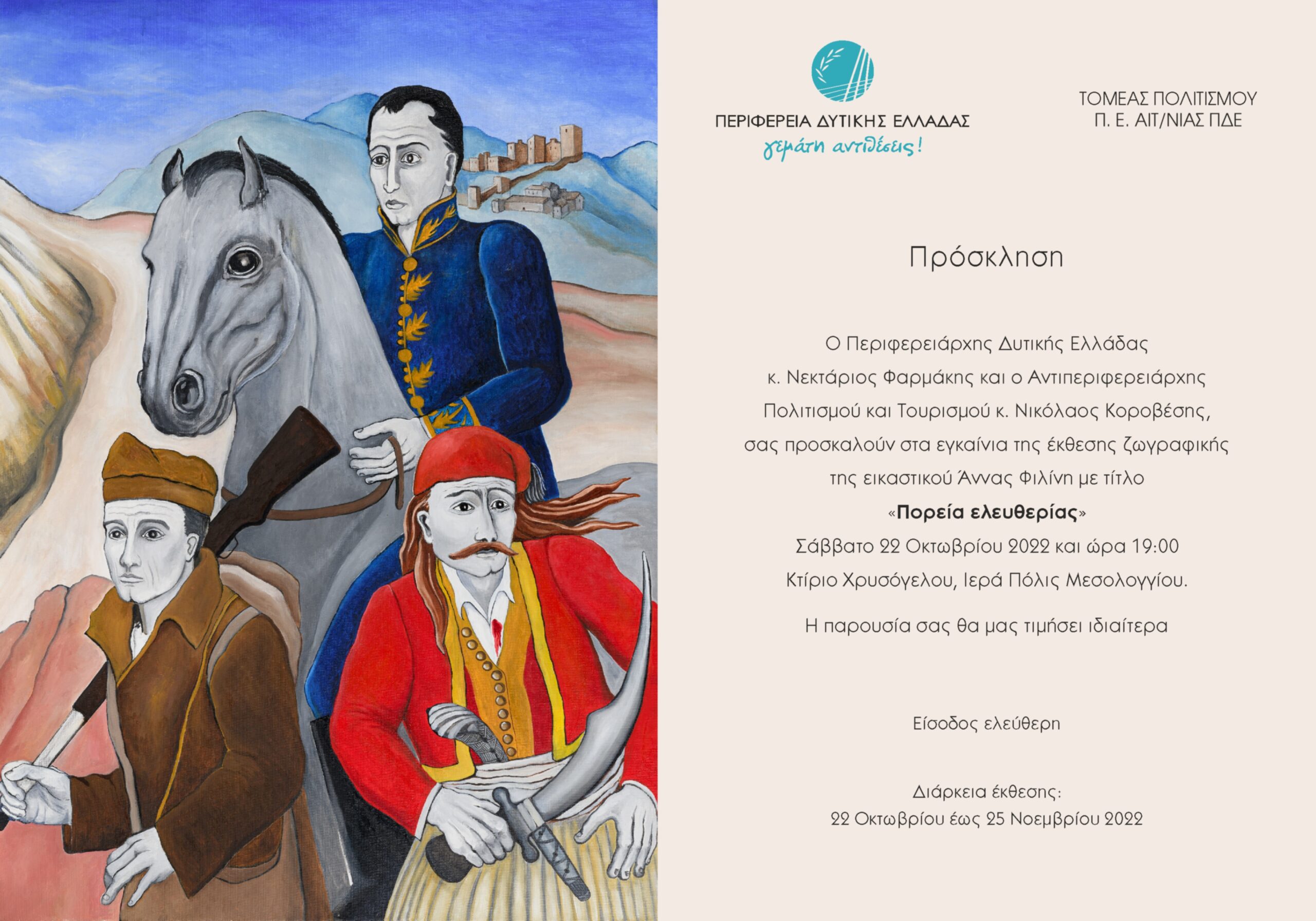 Ο Περιφερειάρχης Δυτικής Ελλάδας Νεκτάριος Φαρμάκης και ο Αντιπεριφερειάρχης Πολιτισμού και Τουρισμού Νικόλαος Κοροβέσης σας προσκαλούν στα εγκαίνια της εικαστικής έκθεσης της Άννας Φιλίνη με τίτλο «Πορεία ελευθερίας». Τα εγκαίνια της έκθεσης θα πραγματοποιηθούν το Σάββατο 22 Οκτωβρίου στις 19:00 μ.μ στο Κτίριο Χρυσόγελου, στην Ιερή Πόλη Μεσολογγίου.