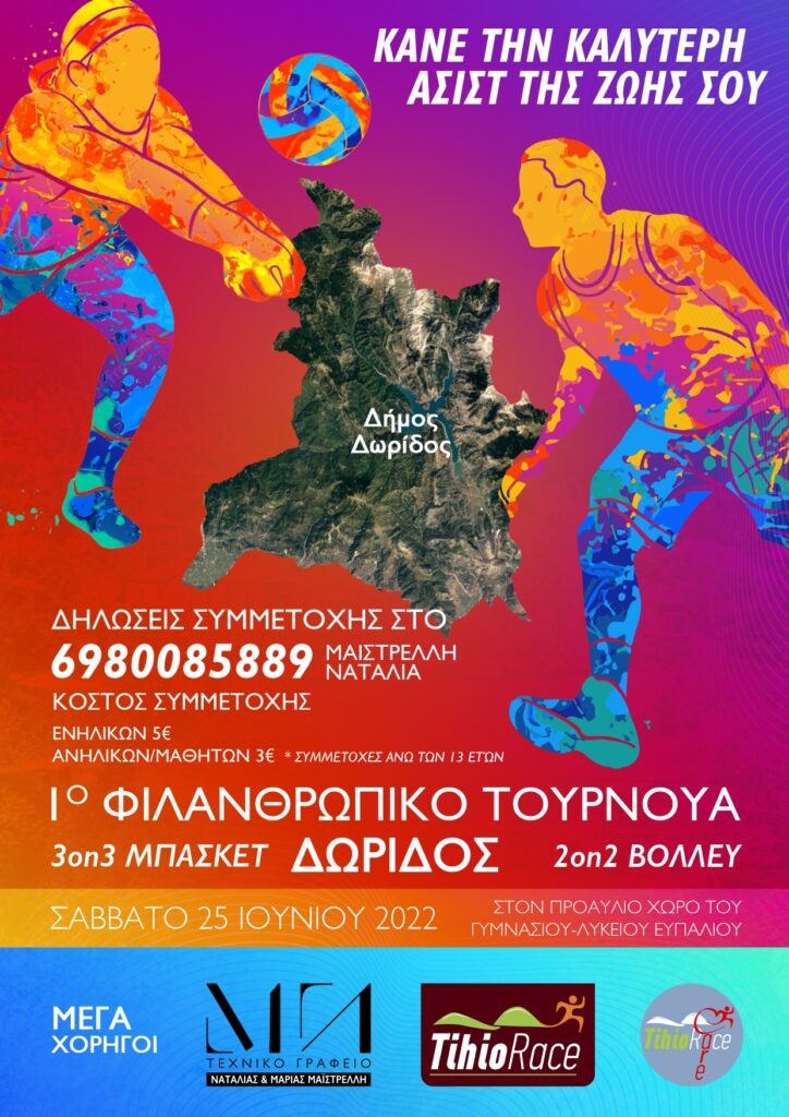 Ο Οργανισμός Παιδείας και Πολιτισμού του Δήμου Δωρίδος διοργανώνει το «1ο φιλανθρωπικό τουρνουά (μπάσκετ 3on3 και βόλεϊ) Δωρίδος», στέλνοντας έμπρακτο μήνυμα αλληλεγγύης σε οικογένειες που χρίζουν της στήριξής μας στην παρούσα δύσκολη συγκυρία. Οι δηλώσεις συμμετοχής (οδηγίες σε σχετικές πρόσφατες ανακοινώσεις του Δήμου) ολοκληρώνονται σήμερα Πέμπτη 23 Ιουνίου 2022!