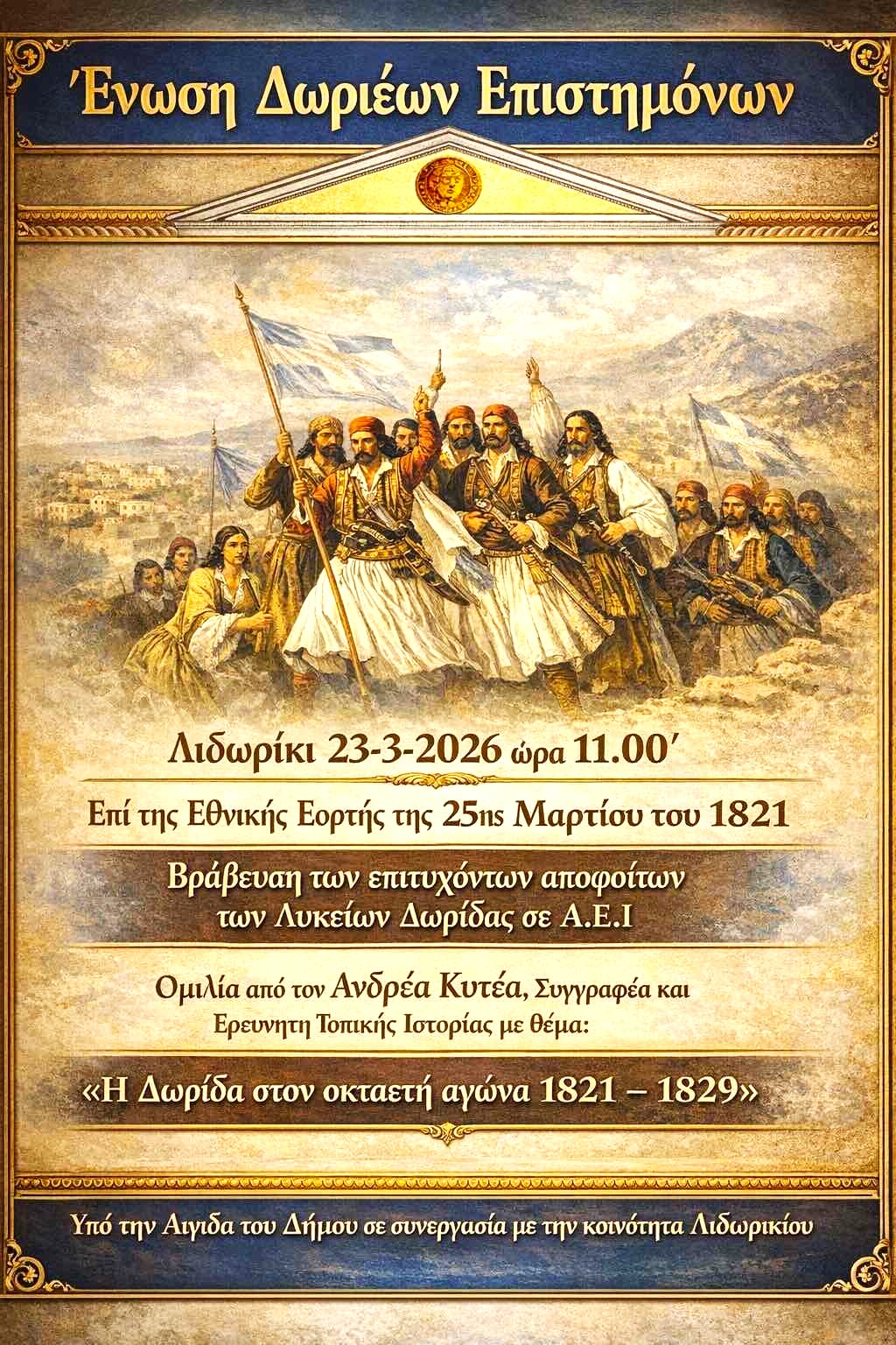 Την επετειακή ετήσια θεσμική εκδήλωση βράβευσης επιτυχόντων αποφοίτων των Λυκείων της Δωρίδας στα Πανεπιστήμια πραγματοποιεί τη Δευτέρα 23 Μαρτίου 2026, ώρα 11:00 στο Λιδωρίκι η Ένωση Δωριέων Επιστημόνων (ΕΔΕΠ).