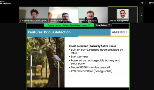Σκοπός της συνάντησης ήταν η παρουσίαση και αναλυτική ενημέρωση σχετικά με το πιλοτικό σύστημα αναγνώρισης του Δάκου του εντόμου που προσβάλλει τις ελαιοκαλλιέργειες, καθώς και το λογισμικό και η εγκατάσταση που αναπτύσσονται στο πλαίσιο του έργου Ambitious. Οι συμμετέχοντες ενημερώθηκαν διεξοδικά για τη λειτουργία του εργαλείου, τα μέχρι στιγμής αποτελέσματα και τις τεχνικές παραμέτρους εφαρμογής του στο πεδίο.