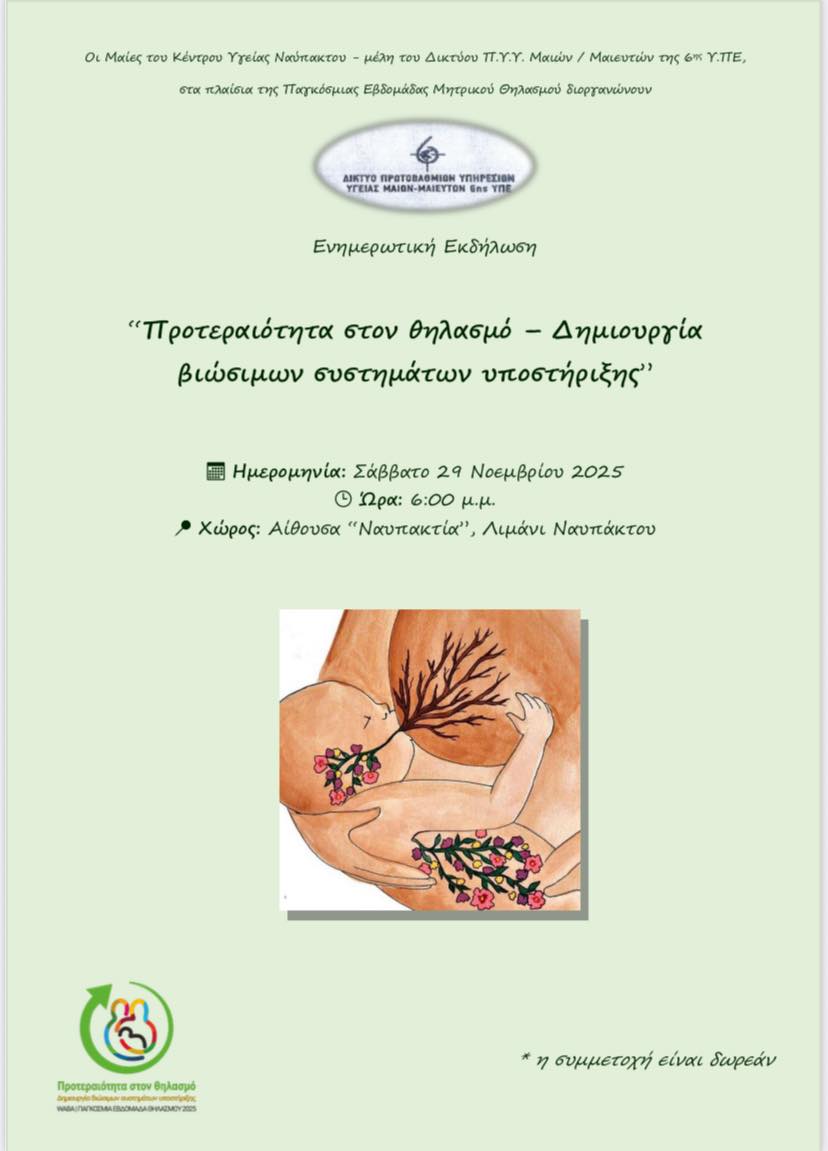 Στο πλαίσιο των δράσεων του Υπουργείου Υγείας για την Παγκόσμια Εβδομάδα Μητρικού Θηλασμού 2025, οι Μαίες του Κ.Υ. Ναυπάκτου – μέλη του Δικτύου Π.Υ.Υ Μαιών/Μαιευτών της 6ης Υ.ΠΕ διοργανώνουν ενημερωτική εκδήλωση με στόχο την προώθηση και προάσπιση του μητρικού θηλασμού.