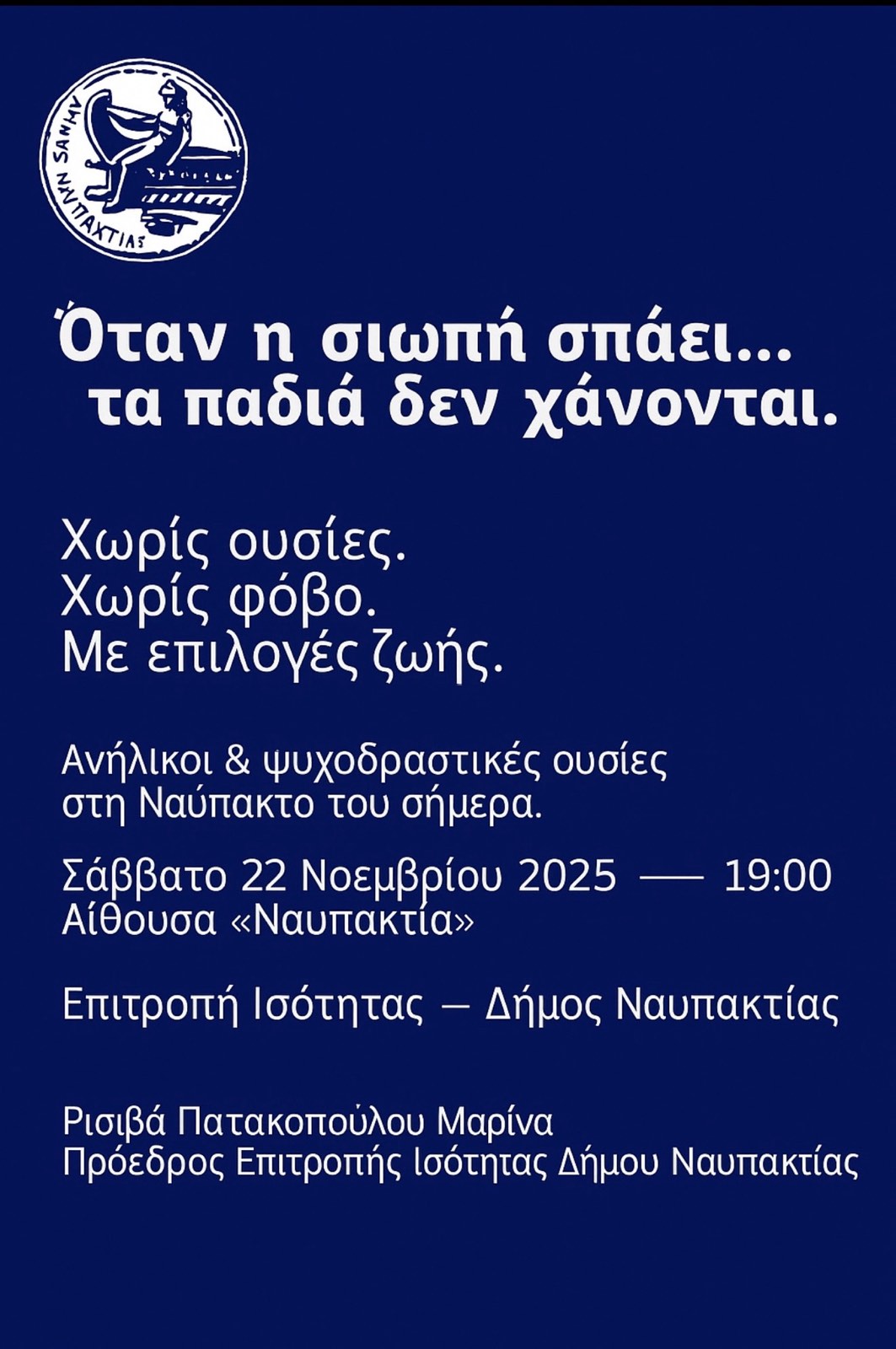 Η Επιτροπή Ισότητας του Δήμου Ναυπακτίας διοργανώνει ενημερωτική εκδήλωση με τίτλο: