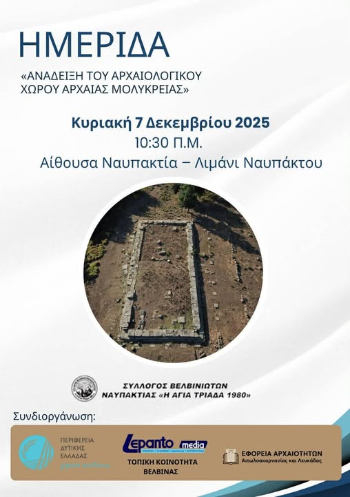 Αυτή την Κυριακή 7 Δεκεμβρίου, η Βελβίνα και πάλι στο επίκεντρο της ειδησεογραφίας. Στις 10:30 το πρωί θα λάβει χώρα στην αίθουσα Ναυπακτία στο λιμάνι της πόλης η ενημερωτική ημερίδα με θέμα «Ανάδειξη του Αρχαιολογικού Χώρου της Αρχαίας Μολυκρείας», στο Ελληνικό Βελβίνας. Την διοργάνωση έχει αναλάβει η Τοπικη Κοινότητας Βελβίνας με τον Σύλλογο Βελβινιωτών Ναυπακτίας «Η Αγία Τριάδα», με συνδιοργανωτές την Περιφέρεια Δυτικής Ελλάδας και την Εφορεία Αρχαιοτήτων Αιτωλοακαρνανίας και Λευκάδας.