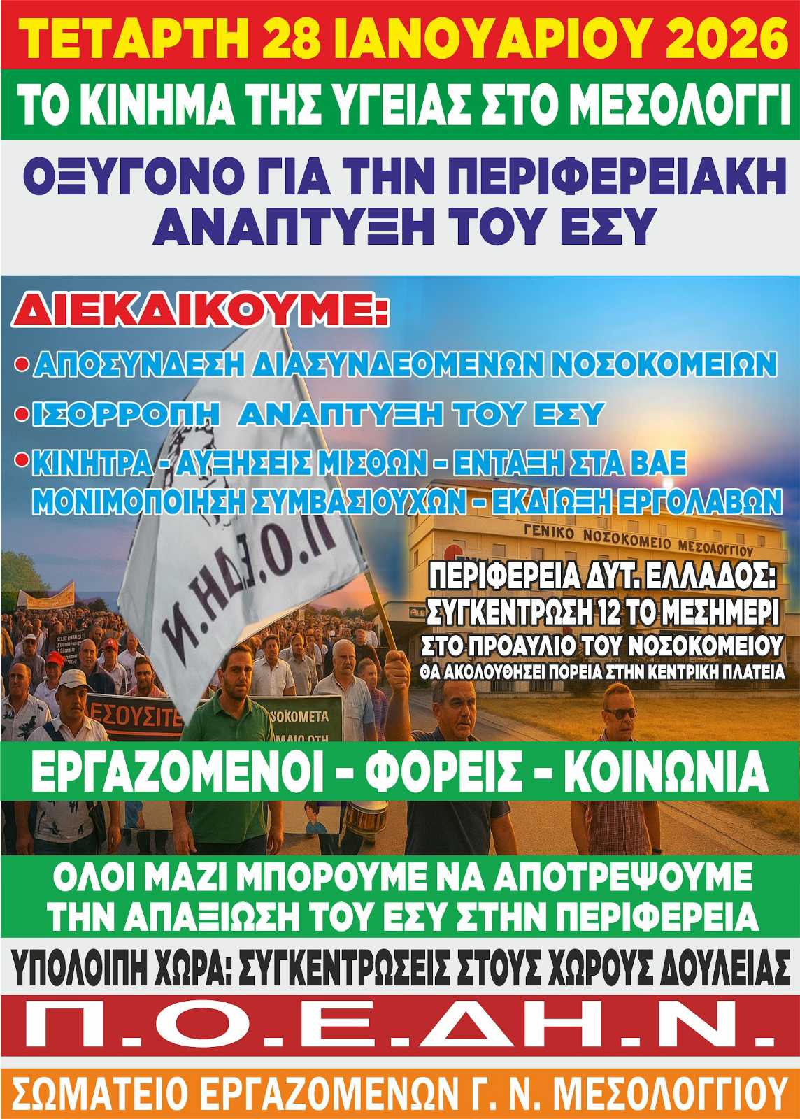 Το Σωματείο Εργαζομένων του Νοσοκομείου Μεσολογγίου και η ΠΟΕΔΗΝ καλεί τους εργαζόμενους, τους φορείς και όλους τους πολίτες της περιοχής να συμμετέχουν στην κινητοποίηση που θα πραγματοποιηθεί την Τετάρτη 28 Ιανουαρίου 2026 και ώρα 12:00, με αφετηρία τον αύλειο χώρο του Νοσοκομείου Μεσολογγίου και πορεία στην κεντρική πλατεία της πόλης.