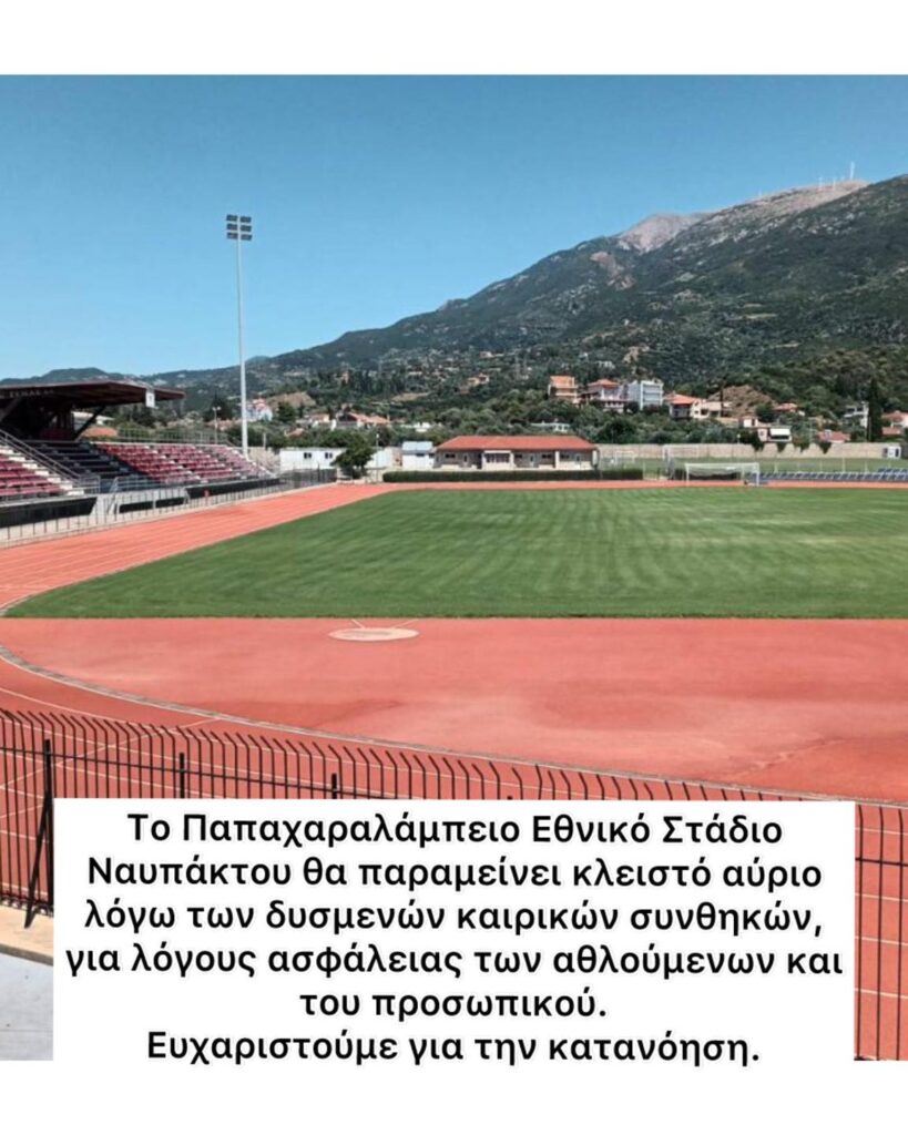 Με ανακοίνωσή του το Εθνικό Παπαχαραλάμπειο Στάδιο Ναυπάκτου κάνει γνωστό ότι για σήμερα Τετάρτη, λόγω των δυσμενών καιρικών συνθηκών, θα παραμείνει κλειστό.