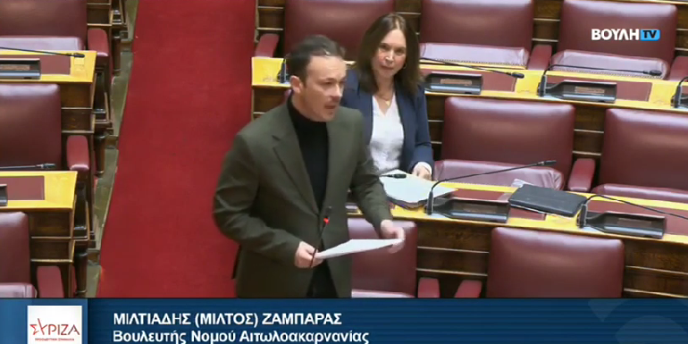 Στην Ολομέλεια της Βουλής συζητήθηκε η Επίκαιρη Ερώτηση που κατέθεσε ο Βουλευτής Αιτωλοακαρνανίας και Τομεάρχης Περιβάλλοντος και Ενέργειας του ΣΥΡΙΖΑ–ΠΣ, Μίλτος Ζαμπάρας, προς το Υπουργείο Περιβάλλοντος και Ενέργειας, με αντικείμενο το δυσβάσταχτο κόστος ηλεκτρικής ενέργειας που πλήττει την ελληνική βιομηχανία, τις μεταποιητικές μονάδες και τις μικρομεσαίες επιχειρήσεις.