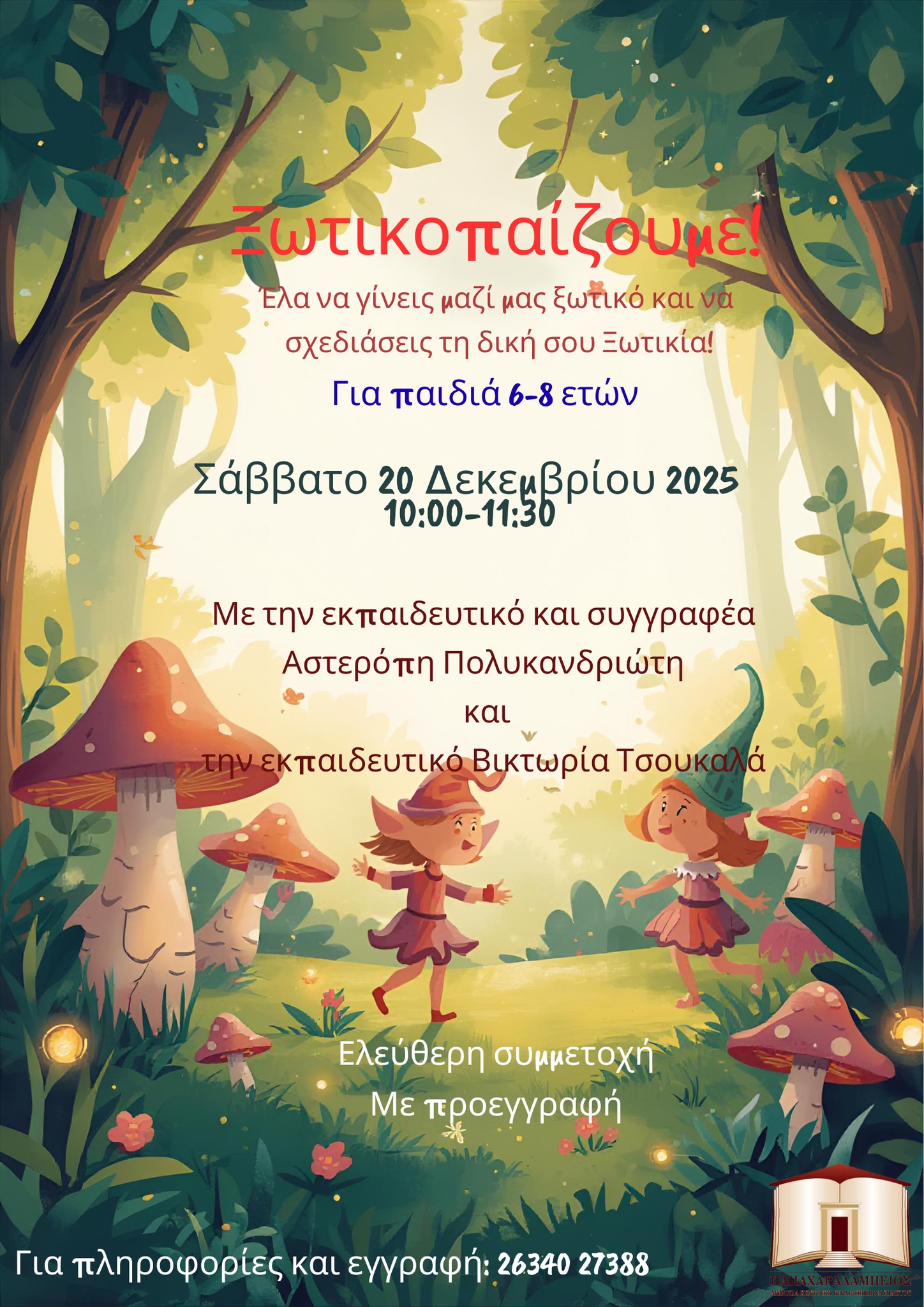 Το Σάββατο 20 Δεκεμβρίου 2025 (10:00-11:30) η Παπαχαραλάμπειος Δημόσια Βιβλιοθήκη στη Ναύπακτο καλεί όλους τους μικρούς μας φίλους, ηλικίας 6-8 ετών, να ξωτικοπαίξουνε!