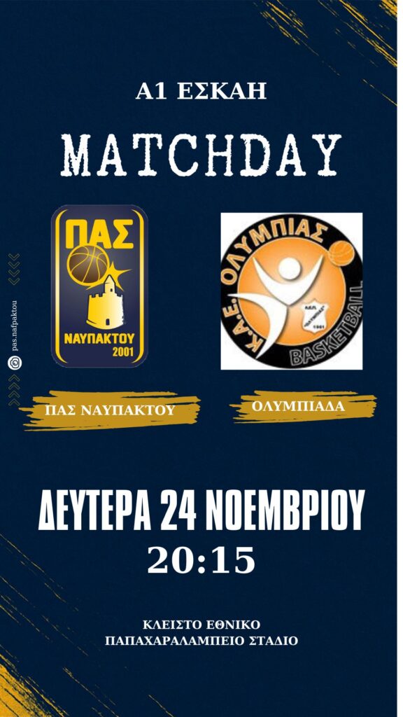 Σήμερα Δευτέρα 24/11/2025 στις 20:15 ο ΠΑΣ Ναυπάκτου υποδέχεται την Ολυμπιάδα Πατρών, στο Παπαχαραλαμπειο κλειστό γυμναστήριο.