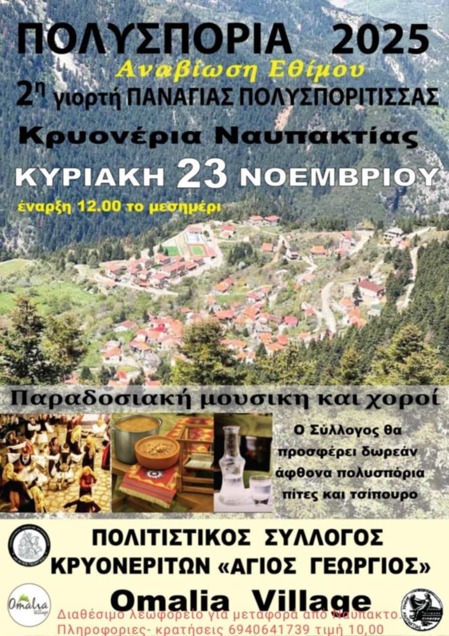 Ο Πολιτιστικός Σύλλογος Κρυονεριτών “Άγιος Γεώργιος” την Κυριακή 23 Νοεμβρίου, στις 12:00, αναβιώνει ένα όμορφο έθιμο του τόπου, αφιερωμένο στην Παναγία τη Μεσοσπορίτισσα – την Πολυσπορίτισσα, προστάτιδα της σποράς και της γης η οποία γιορτάζει στις 21 Νοεμβρίου, ανήμερα των Εισοδίων της Θεοτόκου.