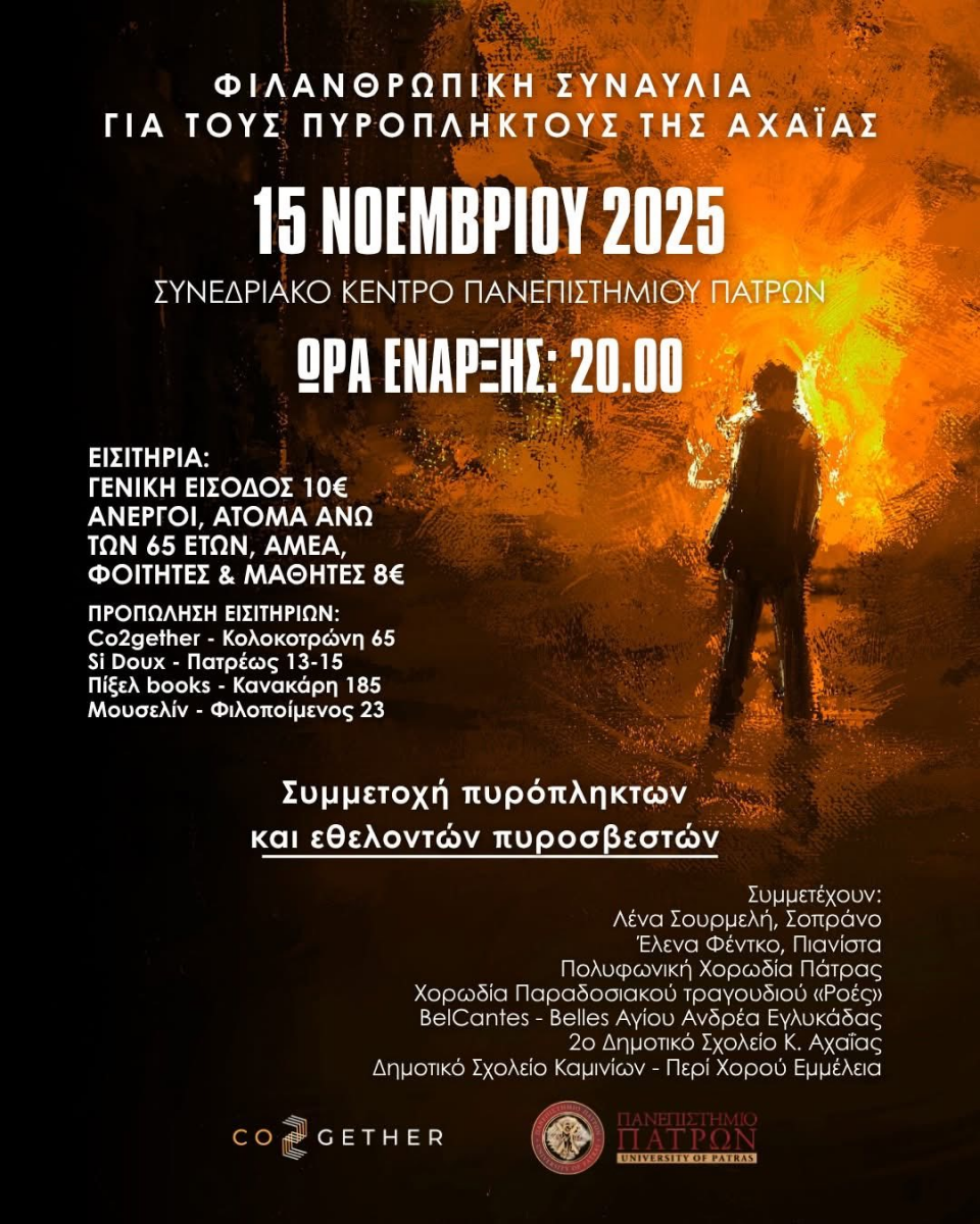 Στις 15 Νοεμβρίου 2025 και ώρα 20:00′ πραγματοποιείται φιλανθρωπική συναυλία για τους πυρόπληκτους της Αχαΐας στο Συνεδριακό Κέντρο του Πανεπιστημίου Πατρών.
