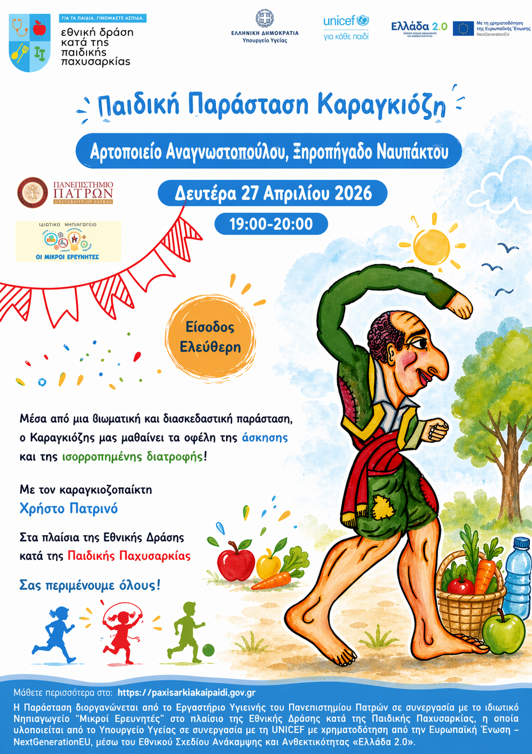 Η εκδήλωση υλοποιείται από την Επιστημονική Ομάδα του Πανεπιστημίου Πατρών με επιστημονικό υπεύθυνο τον κ. Μιχάλη Λεοτσινίδη, σε συνεργασία με το Ιδιωτικό Νηπιαγωγείο Ναυπάκτου «Οι Μικροί Ερευνητές», στο πλαίσιο της Εθνικής Δράσης κατά της Παιδικής Παχυσαρκίας. Η δράση πραγματοποιείται από το Υπουργείο Υγείας σε συνεργασία με τη UNICEF, με χρηματοδότηση από την Ευρωπαϊκή Ένωση – NextGenerationEU, μέσω του Εθνικού Σχεδίου Ανάκαμψης και Ανθεκτικότητας «Ελλάδα 2.0».