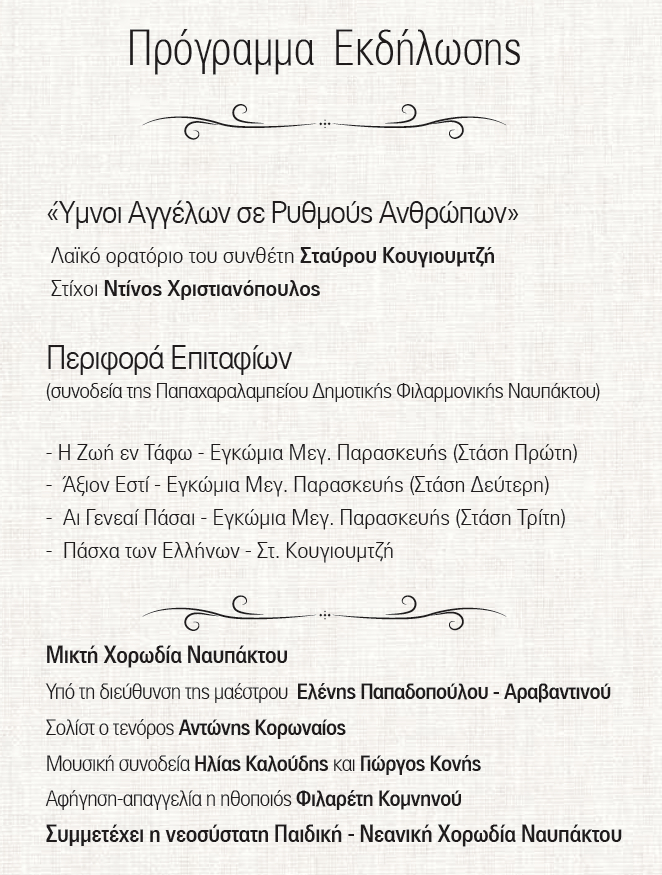 Κατά τη διάρκεια της πομπής των Επιταφίων και μέχρι την άφιξή τους στο Ενετικό Λιμάνι, η Μικτή Χορωδία Ναυπάκτου με σολίστ τον τενόρο Αντώνη Κορωναίο, υπό τη διεύθυνση της μαέστρου Ελένης Παπαδοπούλου-Αραβαντινού, θα αποδώσουν το λαϊκό ορατόριο «Ύμνοι Αγγέλων σε Ρυθμούς Ανθρώπων» του Σταύρου Κουγιουμτζή, σε στίχους του Ντίνου Χριστιανόπουλου, τα Εγκώμια της Μεγάλης Παρασκευής «Η Ζωή εν Τάφω», «Άξιον Εστί» και «Αι Γενεαί Πάσαι», καθώς και το «Πάσχα των Ελλήνων».  Συμμετέχει η Παιδική-Νεανική Χορωδία Ναυπάκτου.  Στην αφήγηση και απαγγελία θα είναι η ηθοποιός Φιλαρέτη Κομνηνού.  Συμμετέχουν οι μουσικοί Ηλίας Καλούδης και Γιώργος Κονής.