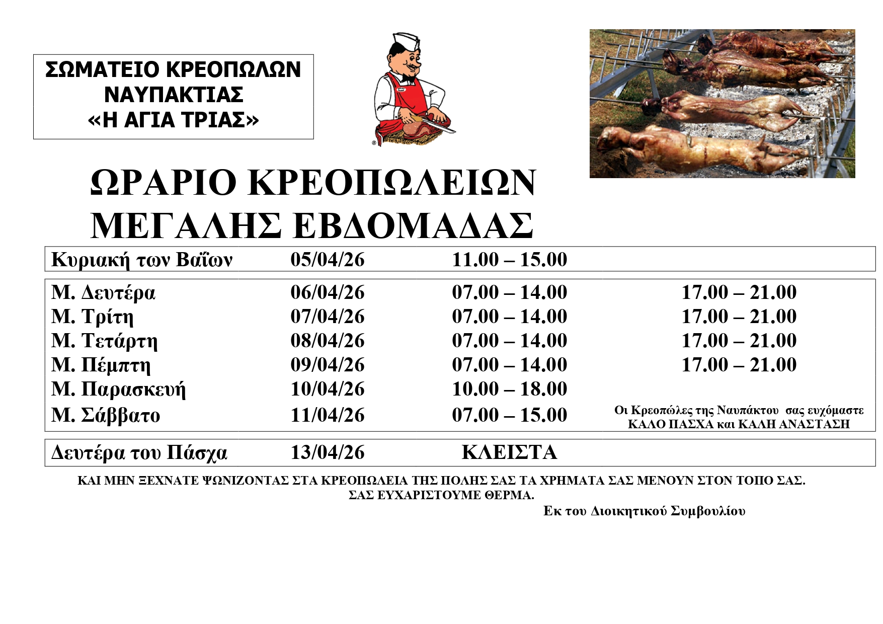 Το ωράριο λειτουργίας των κρεοπωλείων της Ναυπάκτου τη Μεγάλη Εβδομάδα