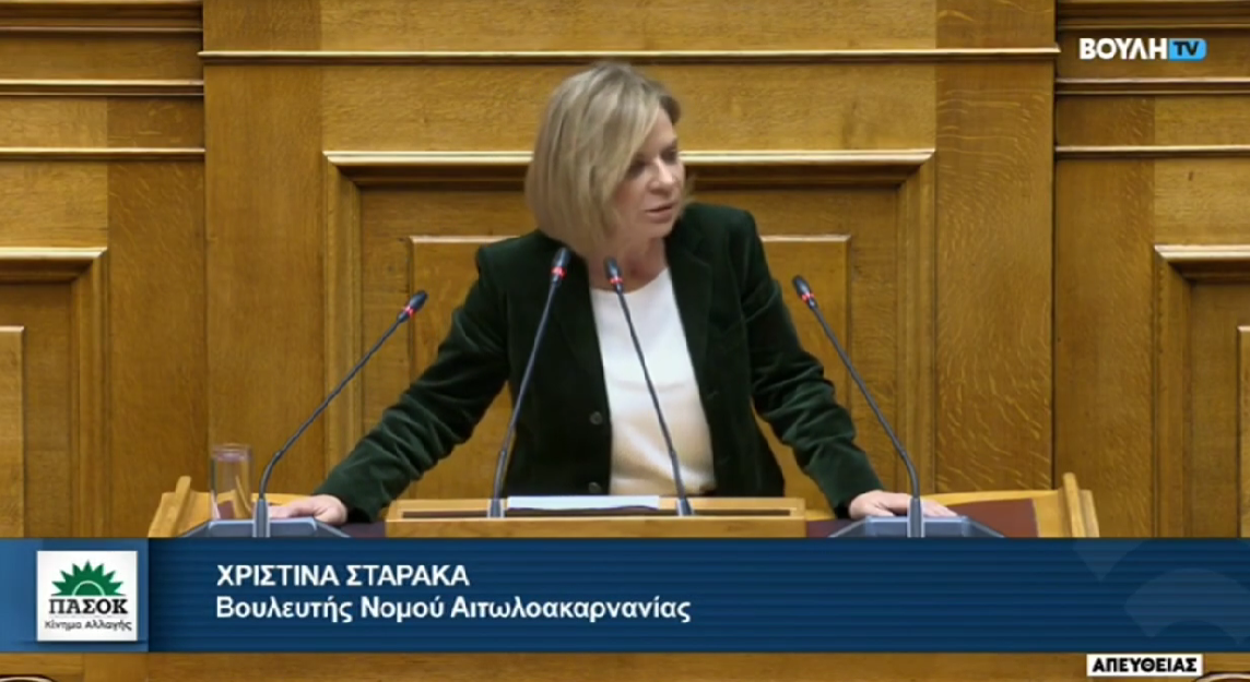 Στην Ολομέλεια της Βουλής, κατά τη συζήτηση του νέου φορολογικού νομοσχεδίου, η Βουλευτής Αιτωλοακαρνανίας του ΠΑΣΟΚ – Κινήματος Αλλαγής, Χριστίνα Σταρακά, άσκησε σκληρή κριτική στην κυβέρνηση, κάνοντας λόγο για ανισορροπία, κοινωνική αδικία, εγκατάλειψη της περιφέρειας και πολιτικές που θέτουν υπό εξαφάνιση τη μεσαία τάξη.