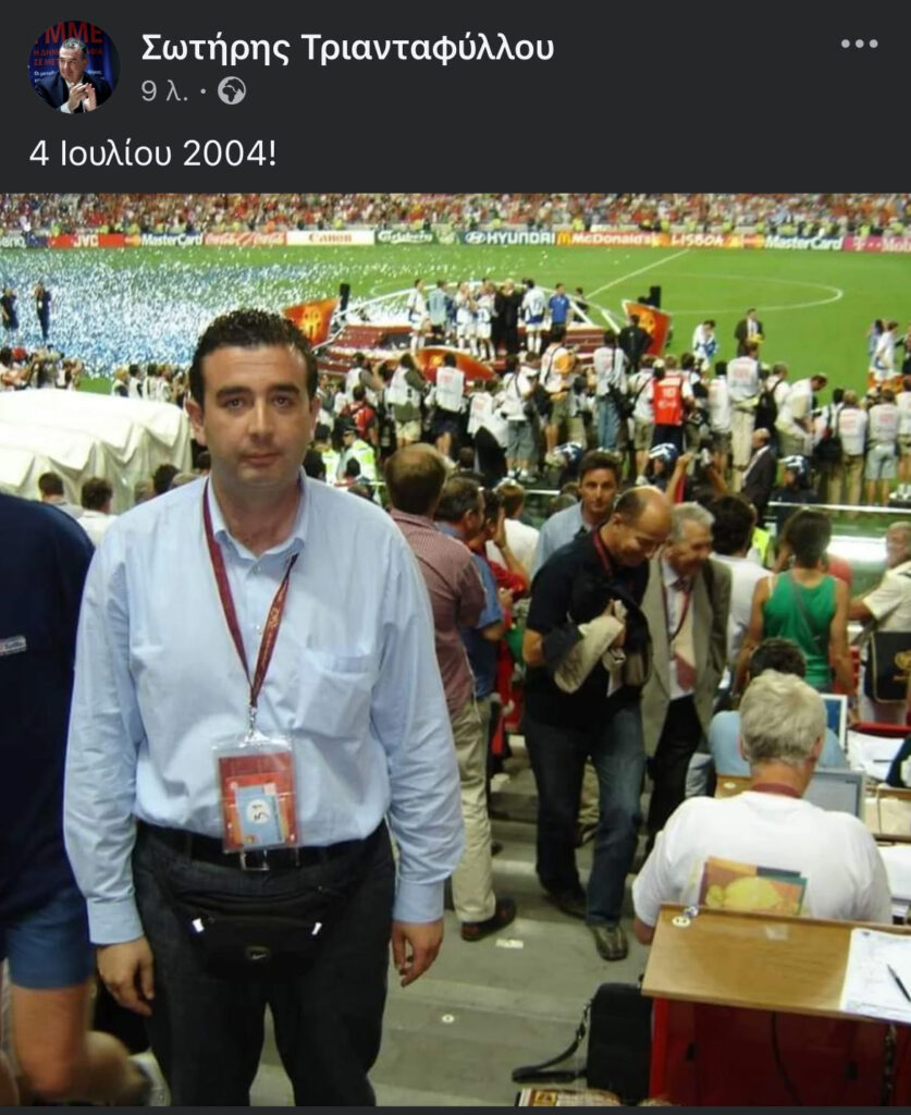 Εικοσιένα χρόνια πριν, 4 Ιουλίου 2004, η Εθνικής Ελλάδος στο ποδόσφαιρο ανεβαίνει στην κορυφή της Ευρώπης, επικρατώντας στον τελικό του Euro, της οικοδέσποινας Πορτογαλίας με 1-0. Παρών σε εκείνη τη διαδρομή ο σημερινός πρόεδρος της ΠΟΕΣΥ, ο Ναυπάκτιος δημοσιογράφος Σωτήρης Τριανταφύλλου, ο οποίος κάλυπτε το ρεπορτάζ της εθνικής για λογαριασμό της εφημερίδας Goal news.