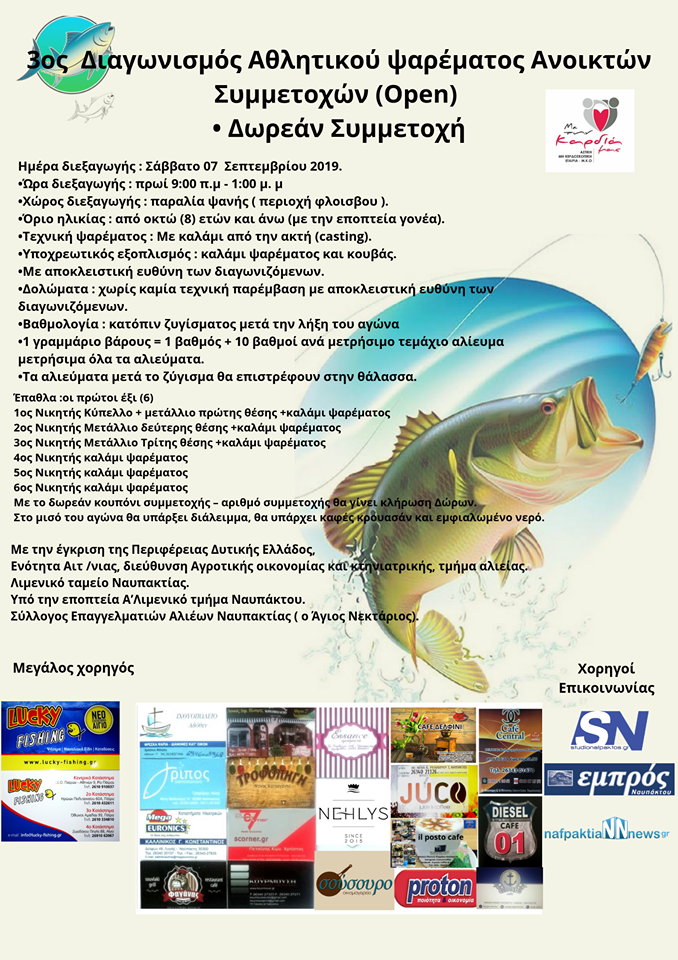 Η Αστική Μη κερδοσκοπική εταιρεία «Με την Καρδιά Μας» στα πλαίσια της κοινωνικής αλληλεγγύης, Αθλητισμού και Περιβάλλοντος, διεξάγει τον 3ο διαγωνισμό Αθλητικού ψαρέματος Ανοικτών Συμμετοχών (Open) στην παραλία Ψανης (περιοχή νεροτσουλήθρες).