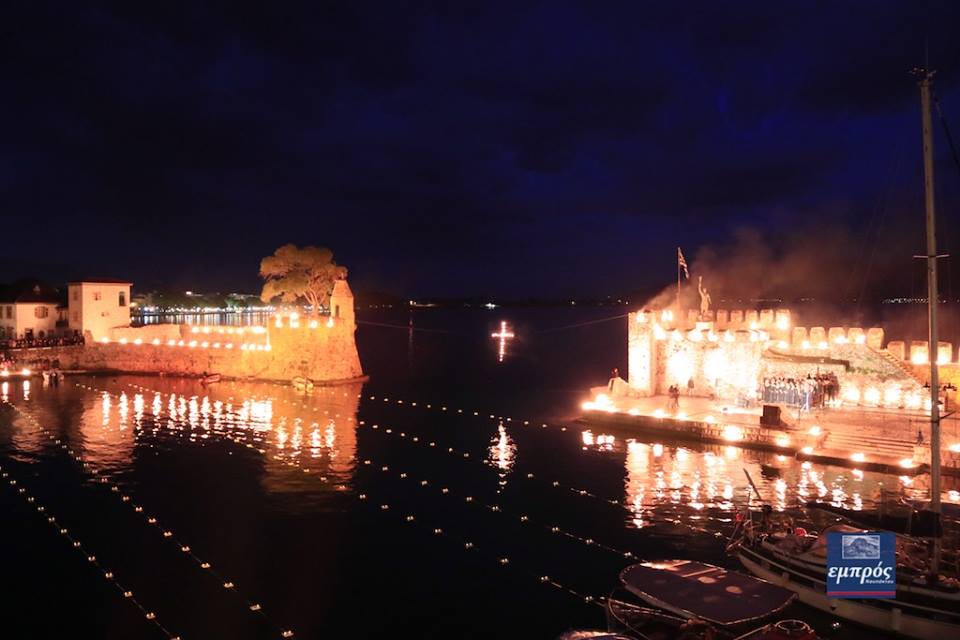 Σε όλη αυτή τη διάρκεια βέβαια το κάστρο, όπως συμβαίνει χρόνια τώρα, σε ένα έθιμο που έχει τις ρίζες του από τα μέσα του προηγούμενου αιώνα, θα «φλέγεται» από τις δεκάδες εστίες φωτιάς που θα έχουν προσεκτικά τοποθετηθεί, ενώ το δικό της φως θα εκπέμπει και η θάλασσα, εντός του λιμανιού, στην οποία θα έχουν τοποθετηθεί τα φλεγόμενα φαναράκια. Η αποχώρηση των επιταφίων, βέβαια, θα συνοδευτεί από τα πυροτεχνήματα που ο δήμος έχει φροντίσει να γεμίζουν το Ναυπακτιακό ουρανό, δίνοντας έναν τόνο χαρμολύπης στην ημέρα, όπως συνηθίζεται να λέμε όλα αυτά τα χρόνια.